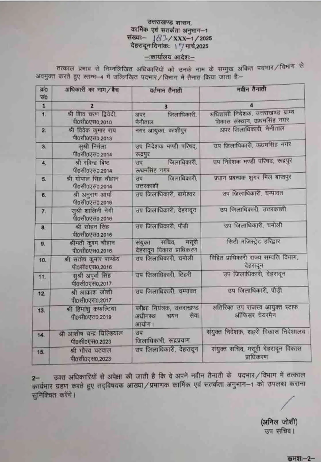 उत्तराखंड में मंगलवार को 15 पीसीएस अफसरों के तबादले किए गए। शासन ने इसके आदेश जारी कर दिए हैं। पीसीएस कुश्म चौहान को हरिद्वार का सिटी मजिस्ट्रेट बनाया गया है। वहीं, अपूर्वा सिंह को उपजिलाधिकारी देहरादून बनाया गया है।