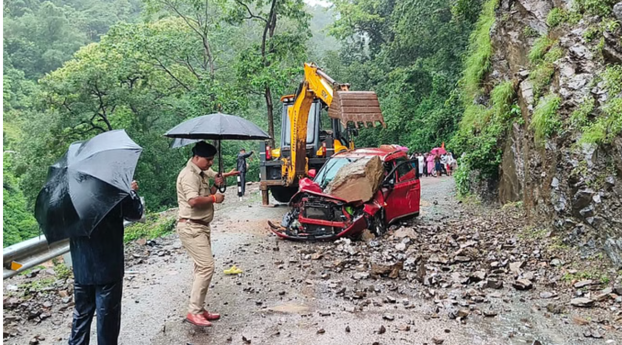 ऋषिकेश लक्ष्मण झूला-नीलकंठ मोटर मार्ग पर घट्टूघाड के पास सोमवार सुबह एक कार के ऊपर अचानक पहाड़ी से पत्थर गिर गया। तेज बारिश के चलते हुए हादसे में कार का आगे का हिस्सा बुरी तरह क्षतिग्रस्त हो गया। गनीमत रही कि कार में सवार यात्री सुरक्षित रहे।