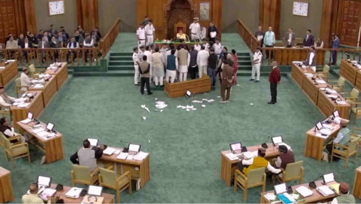 कानून व्यवस्था पर कांग्रेस के विरोध के चलते लगातार कार्यवाही स्थगित की जा रही है। सदन की कार्यवाही के दौरान विपक्षी नेताओं ने सचिव की टेबल पलटने की कोशिश की। साथ ही माइक तोड़ दिया। कांग्रेस विधायकों ने वेल में लहराए कागज। लगातार कर रहे प्रदर्शन और नारेबाजी।